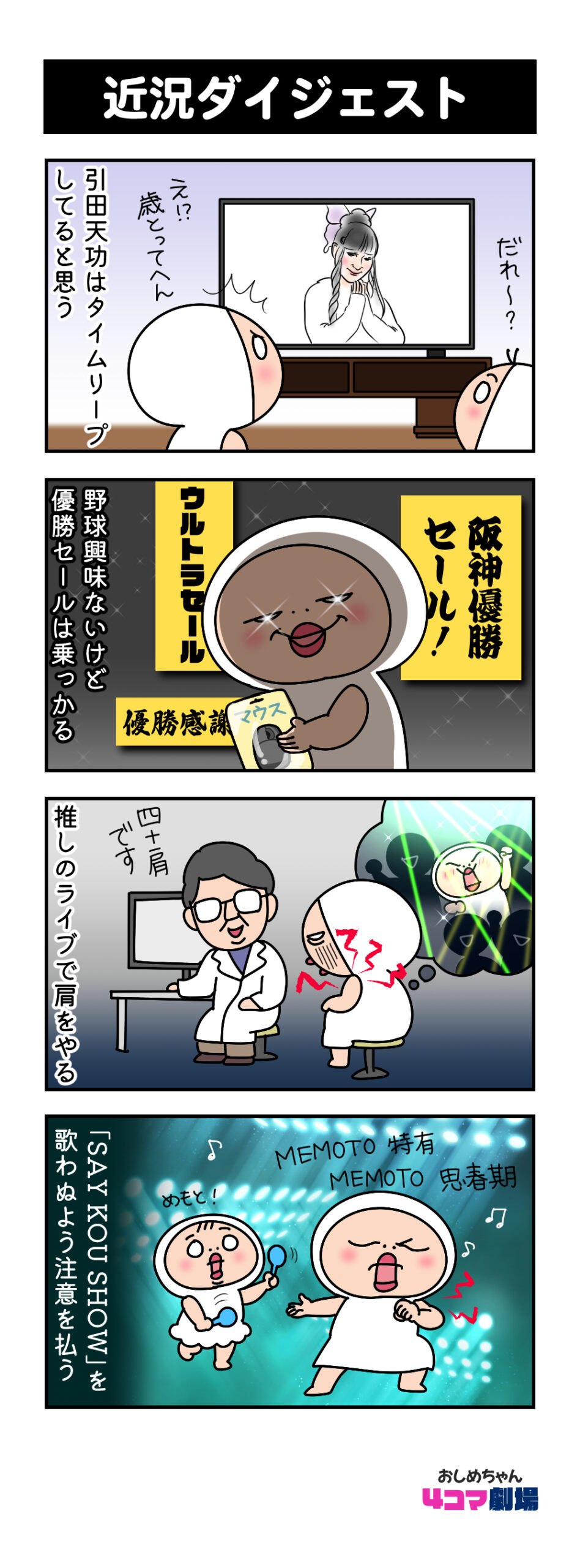 近況ダイジェスト 2025年10月3日2025年10月3日2件のコメント 先月Zepp名古屋で行われた秋山歌謡祭のライブに行った。 めちゃくちゃ楽しかったのに肩がついていけんかった。 アーティスト秋山の楽曲を歌う私を娘は冷めた目でスルーしてると思ったら 実は静かに吸収してて突然一緒に歌い始めるの好き。 マウスはホイールの動きが硬くなって優勝セールで買い替えた。 引田天功さんが腕を上下しながら華麗に舞う姿を見て、しなやかな肩関節を羨んだ。 機械も人間も使い続けると動きが悪くなるからメンテナンスが必要だと痛感した近ごろのまとめ。