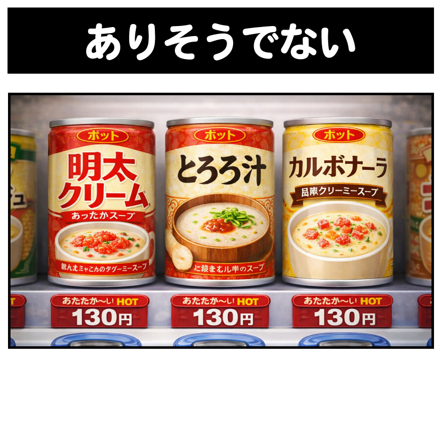 ありそうでない 2026年1月31日2026年1月30日1件のコメント 以上です。 近年ホットの缶飲料がバラエティー豊かになっているので、そのうち登場しそうなやつを考えてみた。ほかにどんなのがあったらいいかな?