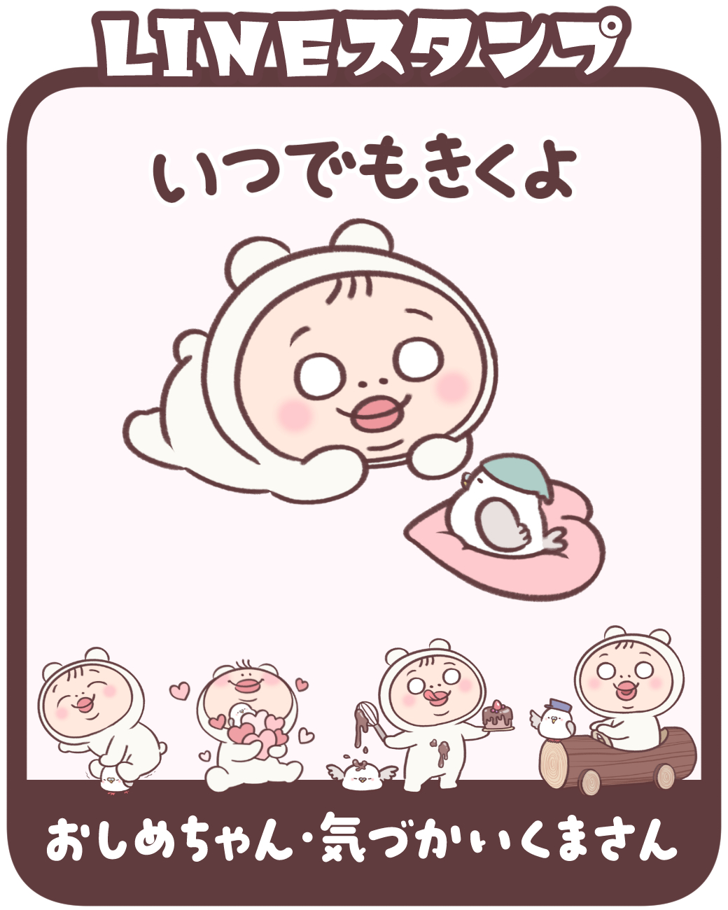 NEWスタンプリリース☆ 2026年2月9日2026年2月9日コメントする LINEスタンプ「おしめちゃん・気づかいくまさん」をリリースしました☆ ハートとハトがいっぱいのハートフルなスタンプ くまを着たおしめちゃんの思いやり溢れる言葉に癒されます ぜひチェックしてね♡